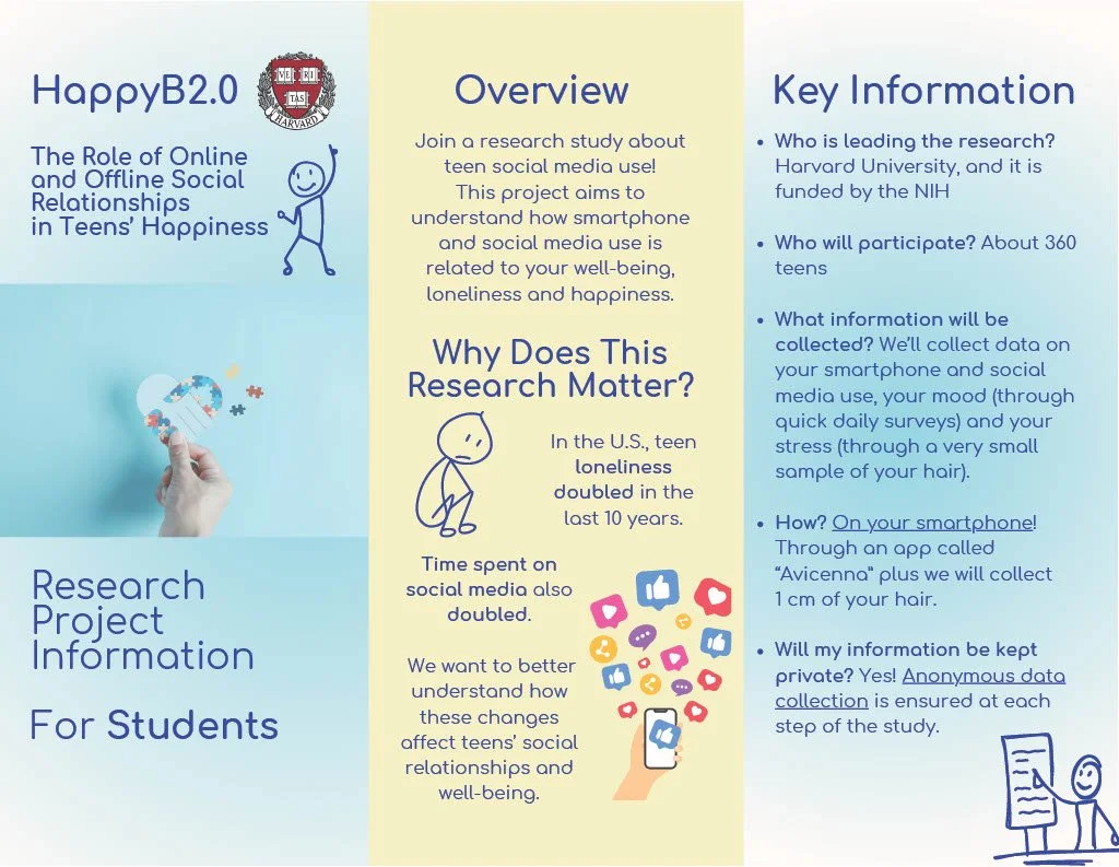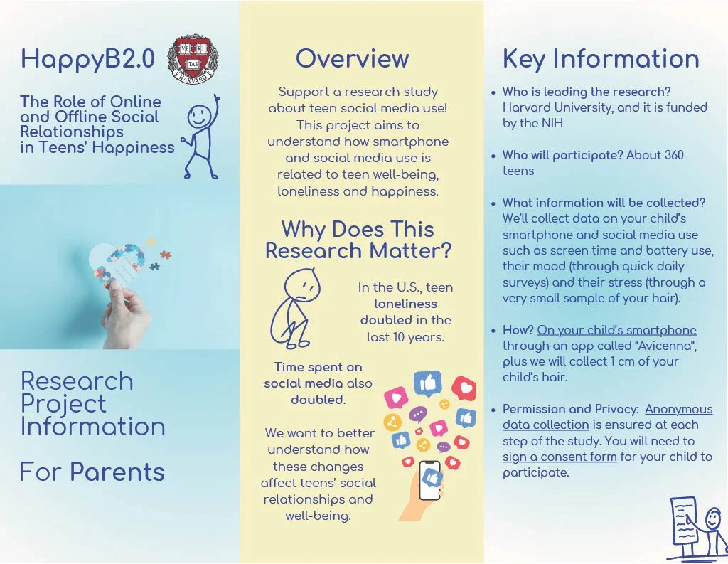 HappyB2.0 aims to investigate how online and offline social relationships predict adolescents’ happiness and loneliness. The study also tests a digital biomarker of stress.